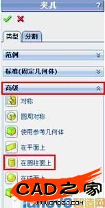 下方的小三角,并單擊下級(jí)菜 單中的“固定幾何體”按鈕,此時(shí)在左側(cè)的特征樹中出現(xiàn)對(duì) 話框。單擊“高級(jí)”,展開“高級(jí)”面板,如圖18所示。單擊“在圓柱面上”按鈕