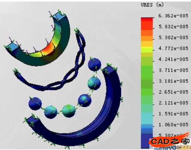 (1)von Mises應力圖解,如圖35所示,爆炸圖解如圖36所示。(爆炸狀態需在分析前設置完成,在分析完成后顯示爆炸視圖即可。)