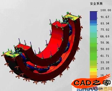 (5)編輯安全系數圖解。 在圖45中顯示出了安全系數在1以下的區域,即圖中的紅色區域,而藍色區域則是安全系數在1以上的區域。