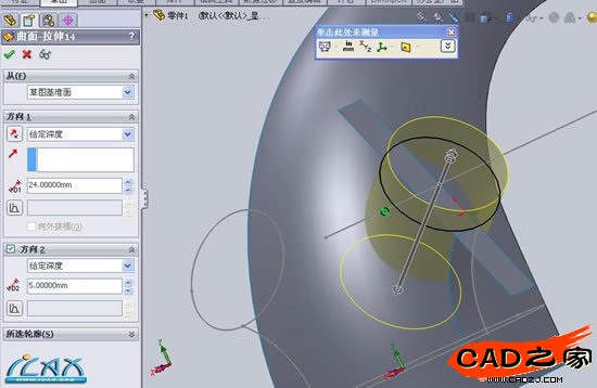 6以剛拉伸的曲面為基準,選取線框中圓形輪廓,轉換實體引用,建立拉伸曲面,方向1深度要超過所建立的主體建構,方向2深度自定,這里選5mm(為什么要拉伸方向2,慢慢往下看)