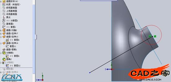 13選右視基準面,和兩圓相交處,建立分割線(這步萬不可省略,將導致以后抽殼的厚度
