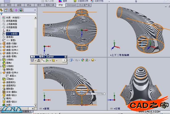 8以右視基準面建立的側邊輪廓線為源圖,建立分割線,將剛拉伸的圓形曲面分割,(這也就是為什么第五步中的側邊輪廓線要延長)