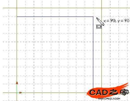 將光標指向原點(草繪原點是默認的三參考平面的交點),按下鼠標,拖動鼠標,形成需要大小的矩形后,松開鼠標。注意鼠標后邊跟隨的不斷變化的數值:x=90,y=90,說明此時矩形的大小。
