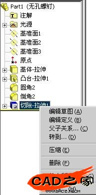 4、右鍵單擊"切除-拉伸1",選擇壓縮,即可實現該配置中沒有通孔特征