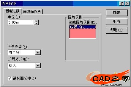 選擇上圖所示5mm的邊,作為圓角的邊,半徑的值改成5mm,其他設置如圖。