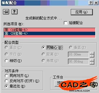 7 對配合方式滿意時請單擊應用。當您關閉裝配配合對話框時,所有延遲的配合條件都被求解,零部件會移至指定的位置,并且此配合會被添加適當的配合組中。