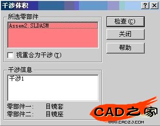 6 如果新選的零部件有干涉情況,您可以單擊檢查來(lái)查看之。 系統(tǒng)會(huì)顯示干涉體積,顯示的三個(gè)尺寸分別為長(zhǎng)、寬、高三個(gè)方向的值