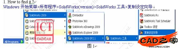 那么在這里就給大家介紹一個方法:復制設定向導。原理:把當前SolidWorks是使用環境(包括:選項、工具條擺放以及快捷鍵等設置)保存為一個文件,使用的時候只需要把它導入,就OK了。