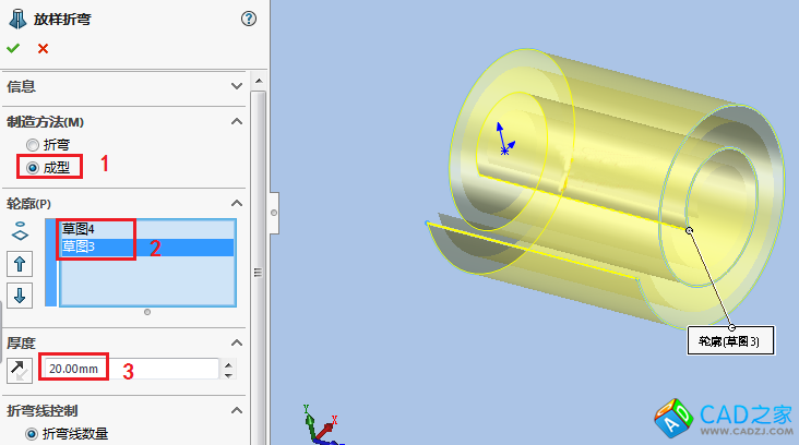 一旦草圖完成,現(xiàn)在是使用鈑金中的【放樣折彎】工具的時候了。 點擊【插入】-【鈑金】-【放樣折彎】,按照下圖進行設(shè)置。制造方法選擇“成型”,厚度設(shè)置為20mm。