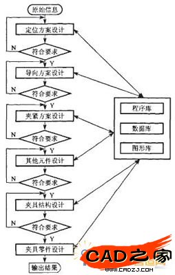 從圖1可見,在基于通用CAD系統(tǒng)薄壁件夾具設(shè)計過程中,夾具CAD系統(tǒng)根據(jù)產(chǎn)品的CAD幾何信息和CAPP加工工藝信息,進行夾具的方案設(shè)計、結(jié)構(gòu)設(shè)計、精度分析、剛度分析、夾具總體裝配,以及二維工程圖的生成,并在此階段對CAPP加工工藝中的有關(guān)定位誤差,夾緊力進行計算和夾具綜合評價、反饋,保證了工藝設(shè)計和夾具方案設(shè)計的合理性.各模塊相對獨立、信息相對集中;信息流動簡單明了,可靠性高;各信息有機結(jié)合,為夾具CAD/CAE/CAM/CAPP等數(shù)據(jù)模型的共享提供了條件.夾具設(shè)計流程如圖2所示.