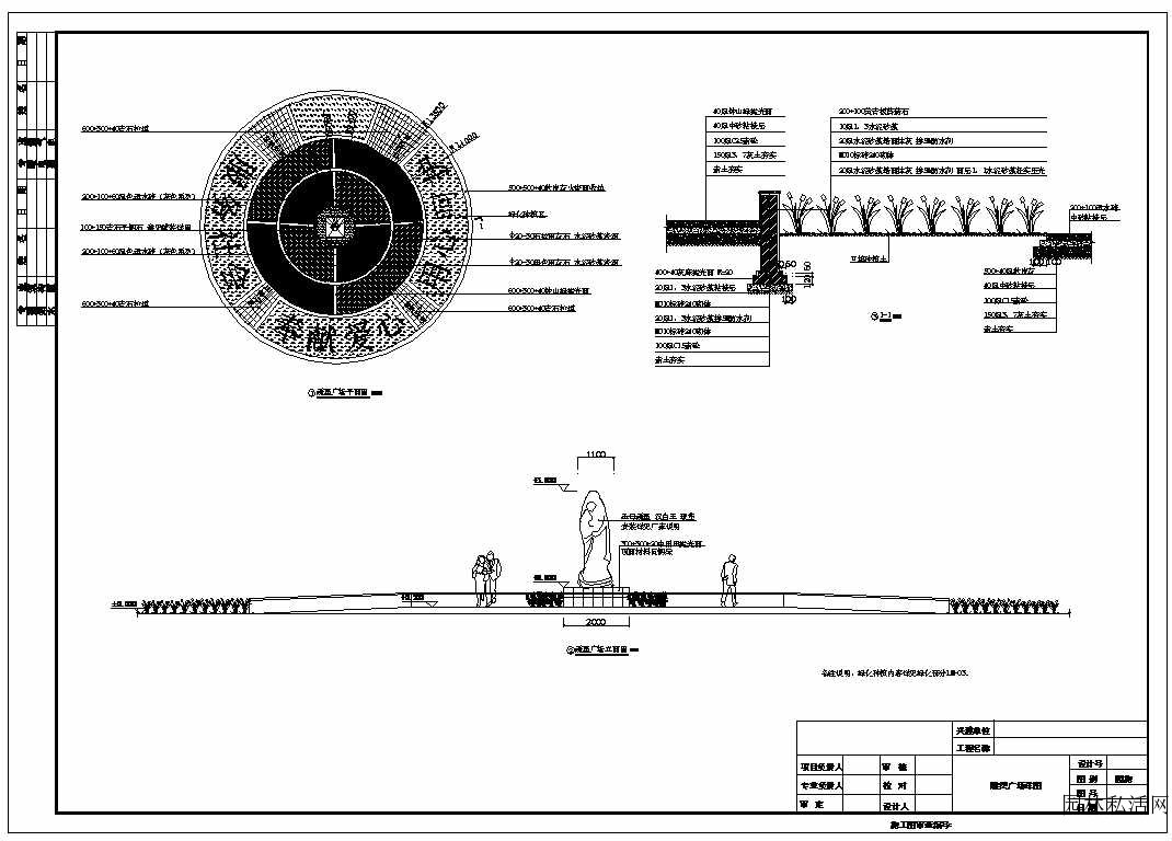 雕塑廣場景觀詳圖包括平面圖、立面圖和剖面圖,設計制作規范。