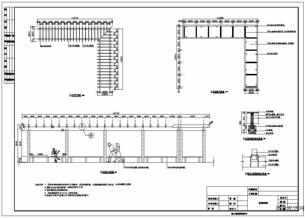 木質(zhì)曲折花架景觀詳圖包含頂平面、底平面、立面、剖面及節(jié)點,制圖標準規(guī)范。