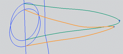 】功能,選擇橢圓的象限點(diǎn)和第(5)步的一個(gè)點(diǎn)建立如圖003的草圖。調(diào)用【編輯-曲線-全部-分割曲線】功能,分別從點(diǎn)處分割兩條曲線。如圖004所示。