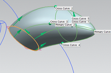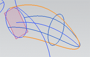 】功能,選擇曲線為第11步建立的橢圓,第12步建立的橢圓和第9步建立的曲線終點(diǎn)。交叉曲線為第13步建立的4條曲線。如圖015所示。