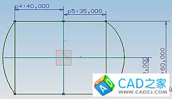 2)通過上面創建好的直線與矩形交點和參考線與矩形的交點創建圓弧,約束尺寸。如下圖。