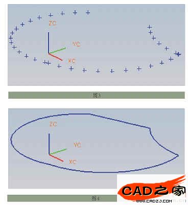 通常一個截面是由多條實體線組成,所以在進行點集處理時要分段處理,在編寫GRIP程序時要尤其注意這一點。如圖1所示,由四條實線構成的一個封閉截面,其中一條為直線,三條為不規則曲線。處理成點集后的效果如圖2所示,它是根據精度弦高公差為0.001cm來進行的點集處理,可以看到直線段處只有兩個點,即直線的起點和終點。這個特點使得在保持精度的同時,大大減少處理點集的復雜程度。圖3為最后的轉變結果,將一個封閉的截面轉變為可控精度的點集。