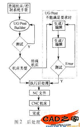 后處理過程是指在產(chǎn)品造型后,產(chǎn)生的零件文件(part)經(jīng)過后處理后生成的刀具路徑文件(PLS)之后,將其轉(zhuǎn)換為機(jī)床認(rèn)可的NC文件的整個(gè)過程。對(duì)不同機(jī)床,不同的CNC系統(tǒng),NC代碼都不同。在生成NC代碼的同時(shí),系統(tǒng)還生成了提交加工任務(wù)書,其中包括NC代碼文件名,后處理程序名輸出符號(hào)種類加工性質(zhì)、刀具種類、順序及編號(hào)等等。我公司是在熟知機(jī)床參數(shù)、掌握CNC系統(tǒng)的情況下,按照下列流程完成UG后處理文件制作的,效果不錯(cuò),其流程圖2說明如下: