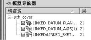 曲軸箱蓋和缸頭蓋等零件使用UG-WAVE技術,分別基于曲軸箱和缸體的幾何和位置關系創建而成。如曲軸箱蓋sxh_cover的創建,先把曲軸箱零件sxh_crankcase中的輪廓草圖和參考基準鏈接到sxh_cover零件中,以鏈接過來的基準為基準創建草圖,并建立和鏈接草圖的幾何約束關系,如圖5所示。這樣就在曲軸箱和蓋之間建立了相關性,當曲軸箱更改時,蓋也將作相應更新。