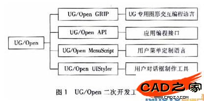 UG軟件提供了CAD/CAE/CAM業(yè)界最先進(jìn)的編程工具集,以滿足用戶二次開(kāi)發(fā)的需要,這組工具集稱之為UG/Open,是一系列UG開(kāi)發(fā)了具的總稱,它們隨UG—起發(fā)布,以開(kāi)放性架構(gòu)面向不同的軟件平臺(tái)提供靈活的開(kāi)發(fā)支持,UG/Open套件主要由4個(gè)開(kāi)發(fā)工具組成,如圖1所示。利用UG/Open提供的應(yīng)用程序和開(kāi)發(fā)工具,用戶可以在其提供的平臺(tái)上開(kāi)發(fā)出適合自己需要的CAD產(chǎn)品。