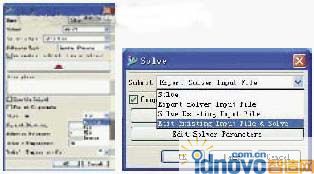 進行有限元劃分、施加材料參數、載荷和邊界條件后,選擇解算Solve,彈出如上右圖對話框,其中的Submit項有Solve、Export Solver Input File、Solve Existing Input File及Edit Existing Input File&Solve選項,我們指定Submit項為Export Solver Input File,然后OK,在同一目錄下形成同名的帶有擴展名為INP的文本文件,該文本文件就是ANSYS的導入文件。
