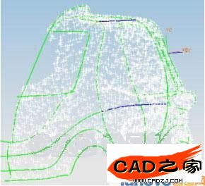 但是本文的車模型用激光掃描測到的數據點多達30萬個,這么多的數據點輸入UG是很困難的,因此我們在Surfacer軟件里對點云數據進行了除噪、稀疏等預處理。而為了準確地保持原來的特征點和輪廓點,我們大體構造了輪廓線和特征線,和點云數據一起導入UG中,如圖1所示。