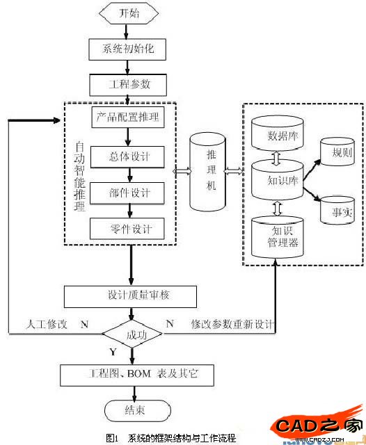從圖中可以看出,本系統(tǒng)進(jìn)行的格柵除污機(jī)設(shè)計(jì),以知識(shí)庫(kù)、數(shù)據(jù)庫(kù)為基礎(chǔ),運(yùn)用獲取的知識(shí)進(jìn)行快速設(shè)計(jì),這種知識(shí)融合于產(chǎn)品模板中,包括成熟的格柵除污機(jī)產(chǎn)品、格柵除污機(jī)設(shè)計(jì)標(biāo)準(zhǔn)、相關(guān)的工程數(shù)據(jù)、專家經(jīng)驗(yàn)、科研結(jié)論等各種形式的知識(shí)。在進(jìn)行產(chǎn)品設(shè)計(jì)時(shí),系統(tǒng)中嵌入了設(shè)計(jì)推理和設(shè)計(jì)過(guò)程引導(dǎo)機(jī)制,設(shè)計(jì)者只需根據(jù)設(shè)計(jì)過(guò)程的引導(dǎo)通過(guò)人機(jī)界面按定單輸入用戶對(duì)產(chǎn)品的要求后,例如渠寬、渠深等主要工程參數(shù)、進(jìn)行簡(jiǎn)單的操作,推理機(jī)就運(yùn)用這些事實(shí)與知識(shí)庫(kù)中的每個(gè)規(guī)則的前提部分依次進(jìn)行匹配,將該規(guī)則的結(jié)論部分作為新的事實(shí)加入到產(chǎn)品設(shè)計(jì)過(guò)程中。整個(gè)設(shè)計(jì)自頂向下,從產(chǎn)品配置推理、總體設(shè)計(jì)、部件設(shè)計(jì)到零件設(shè)計(jì)逐層深入,并驅(qū)動(dòng)數(shù)據(jù)庫(kù)進(jìn)行相應(yīng)更新,直到完成產(chǎn)品所有零部件設(shè)計(jì),最后以產(chǎn)品的裝配形式提供給設(shè)計(jì)者進(jìn)行設(shè)計(jì)質(zhì)量審核,如果審核成功,則可以自動(dòng)生成工程圖、BOM表及其它。如果設(shè)計(jì)人員需要針對(duì)本次設(shè)計(jì)進(jìn)行零部件的局部修改,則可以人工修改對(duì)應(yīng)部件的相關(guān)參數(shù)重新更新模型;如果設(shè)計(jì)者希望這種修改能被以后的設(shè)計(jì)所使用,則可以通過(guò)知識(shí)管理器對(duì)知識(shí)庫(kù)中的知識(shí)進(jìn)行添加或修改,知識(shí)管理器自動(dòng)將這種修改保存到知識(shí)庫(kù)中,同時(shí)驅(qū)動(dòng)數(shù)據(jù)庫(kù)更新模型,并保證下次自動(dòng)智能設(shè)計(jì)時(shí)自動(dòng)選用這種修改。