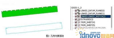 幾何對(duì)象驅(qū)動(dòng)技術(shù)就是將幾何對(duì)象聯(lián)接到其它零部件,使父部件與裝配中的其它組件中的幾何對(duì)象相關(guān)聯(lián)。當(dāng)改變父部件中定義的幾何對(duì)象時(shí),則抽取該幾何對(duì)象的所有部件中的對(duì)應(yīng)幾何對(duì)象會(huì)自動(dòng)更新,從而實(shí)現(xiàn)部件間幾何形狀的自上而下的控制。例如從格柵部件聯(lián)接來(lái)的定距板外形輪廓,如圖3所示。