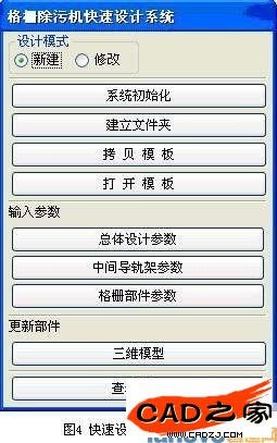 用戶界面主要是提供設(shè)計(jì)人員輸入設(shè)計(jì)參數(shù)以完成設(shè)計(jì)的接口,UGⅢ提供了可視化的對(duì)話框編成環(huán)境,用戶可以根據(jù)產(chǎn)品設(shè)計(jì)要求方便地定制設(shè)計(jì)界面,大大縮短了產(chǎn)品設(shè)計(jì)系統(tǒng)的開(kāi)發(fā)周期。圖4和圖5分別為快速設(shè)計(jì)系統(tǒng)的設(shè)計(jì)界面及格柵除污機(jī)的三維數(shù)字化模型。