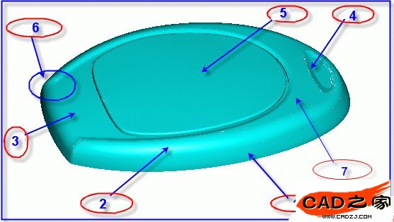 首先,我們在開始造型之前,應該進行仔細的分析,想像出各個面的主要構成方法以及過渡的可能方式,這樣我們才能做到有的放矢。首先整體形狀是有一個圍側面(1)和頂面(7)以及一個類圓角面(2)構成,對于側面(1),在造形之前我們可以猜測它是掃出的或是混成的。對于類似這樣頂面(7),我一般強烈傾向于掃出面,對于(2),一般用圓角搞定沒問題(注意必要的時候切換成conic類型的圓角以更擬合實際情況)。