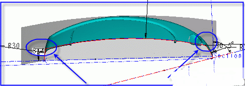 我們創建的原則是簡單先行,在這些面中,顯然頂面是最簡單的,我們先來試試用可變掃出的結果如何。這個掃出面就用主脊線作軌跡,R260的圓弧作截面進行掃出,這樣就可以和上步創建的頂截面相吻合。