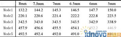 改變橋殼本體厚度做模態分析,結果如表1所示。