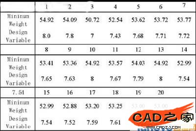 以重量最小化為定義目標,定義約束為許可應力。把橋殼的厚度定為設計變量,其最大值定為8mm,最小值定為6mm。表2為經過20次迭代后的結果[4,5]。