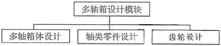 多軸箱的設(shè)計(jì)首先要采用基于裝配的特征建模法建立多軸箱的裝配模型,然后在這個(gè)模型中對零部件展開設(shè)計(jì),多軸箱的設(shè)計(jì)主要包括多軸箱體的設(shè)計(jì)和傳動系統(tǒng)的設(shè)計(jì),而傳動系統(tǒng)是由若干主軸、傳動軸和齒輪組成的。根據(jù)多軸箱的裝配層次,將多軸箱設(shè)計(jì)模塊分為3個(gè)子模塊,如圖1所示。多軸箱設(shè)計(jì)模塊在多軸箱總體裝配模型的平臺上,通過交互界面接受用戶輸入的設(shè)計(jì)數(shù)據(jù)。