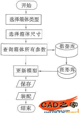 在設(shè)計(jì)多軸箱箱體時(shí),要求用戶選擇多軸箱類型,多軸箱類型分為臥式和立式兩種,其區(qū)別在于前蓋的厚度,然后選擇箱體尺寸,在主控程序中,提供了所有多軸箱的箱體尺寸,避免了查表,便于選擇標(biāo)準(zhǔn)化多軸箱。將多軸箱的箱體尺寸作為查詢條件,在箱體參數(shù)數(shù)據(jù)庫中提取所有設(shè)計(jì)參數(shù),并傳遞給圖形庫中的箱體三維模型,模型按照提供的參數(shù)更新后,用戶選擇保存,在需要的時(shí)候可以裝配到裝配件文件中,多軸箱設(shè)計(jì)流程如圖2所示。