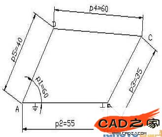 草圖約束包括幾何約束和尺寸約束兩種。尺寸約束用來確定草圖對象的幾何尺寸(如直線的長度、角度等);幾何約束用于定義建立的草圖對象的幾何特性(如直線的水平和豎直)及兩個或兩個以上對象的相互關系(如兩直線垂直、平行等)。對于四桿機構尺寸約束應根據不同的四桿機構的類型來確定,如曲柄搖桿機構中與機架相連的桿長最短,而雙曲柄機構的機架的長度值最小。另外,還必需設置一個初始角,這是進行動畫顯示的一個必要條件。幾何約束也應根據不同的四桿機構的類型及運動特點進行設置,如作為機架的直線必須固定(如圖1中A、B兩點固定),曲柄滑塊機構中滑塊的中心點必須在機架上(點在線上)等,這樣四連桿機構在運動時才能正常運行。