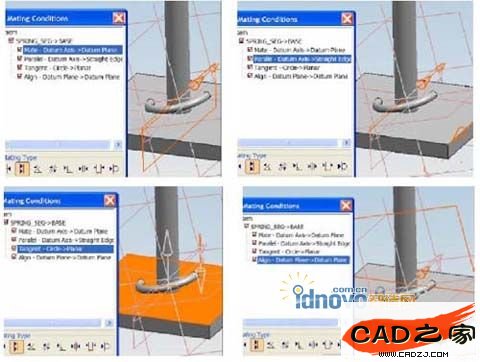 4.裝配spring seg. prt以創建彈簧的第一段,;并且與base. prt建立四個Mate關系,如下圖?