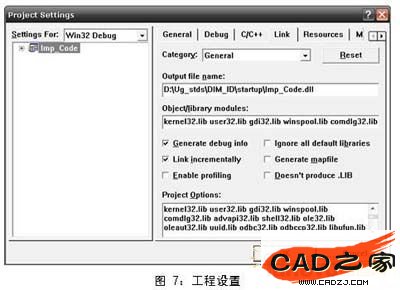 選擇菜單命令Project→Setting,彈出Project Setting對話框,選擇Link選項卡,在Output file name文本框中輸入D:Ug_stdsDIM_IDstartupImp_Code.dll,并在Object/library modules文本框中輸入UG庫文件kernel32.lib、user32.lib、gdi32.lib、winspool.lib、comdlg32.lib advapi32.lib、shell32.lib、ole32.lib、oleaut32.lib、uuid.lib、odbc32.lib、odbccp32.lib、libufun.lib、libugopenint.lib,如圖7所示: