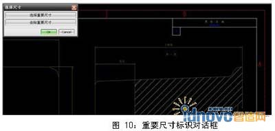 選擇菜單命令Build→Rebuild All,編譯程序后打開UG工程圖模塊,點擊尺寸標識工具條上的重要尺寸,顯示圖10對話框,選取重要尺寸按鈕,并選取一尺寸進行標識,或選取去除重要尺寸按鈕進行去除,如圖11所示。