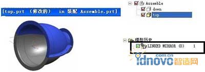 接下來,在裝配中添加一個頂蓋文件top.prt,以top.prt為工作部件,通過WAVE建立與down.prt之間的聯(lián)系,利用“鏡像體”可得到如圖4所示結(jié)果。建立起top.prt與down.prt之間的約束關系,當down.prt的參數(shù)發(fā)生變化時,top.prt的參數(shù)也隨之改變,從而達到參數(shù)化設計要求。
