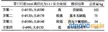 為了驗證設計結果是否合理,作者進行了CAF模擬驗證和實際澆注實驗驗證。作者針對上述圓柱鑄件,根據不同的安全級別設置了四組不同尺寸的冒口進行澆注實驗,并事先分別進行了CAE模擬。實驗方案如表2所示,其中方案二的冒口尺寸就是上述采用冒口智能優化設計系統設計出來的推薦值,即大冒口φ170mmxl70mm、小冒口φ130mmxl30mm。鑄件材料為WCB,澆注初始溫度l560℃,鑄型材質為水玻璃砂。